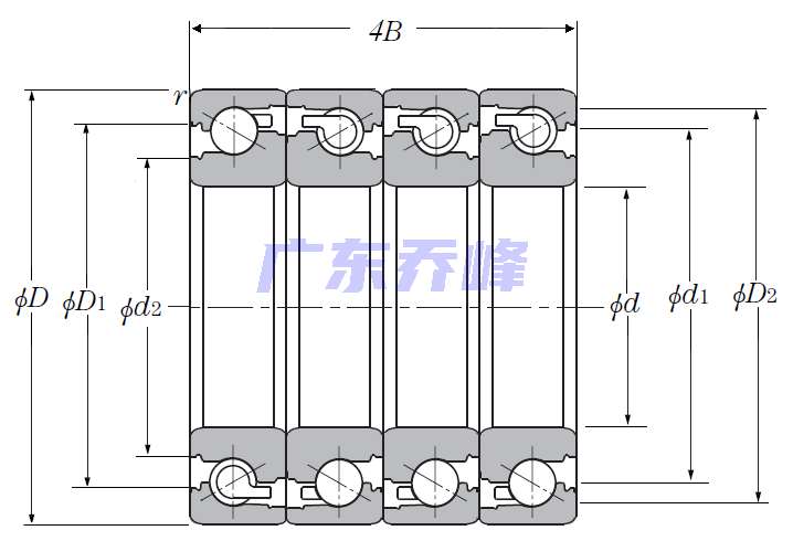 軸承型號:BST40X72-1BDFTT,滾珠絲杠用四列角接觸推力球軸承 - DFTT配對,開式,三排承受軸向載荷,其基礎型號為40X72,前綴列表:【BST:Ball Screw Support,即滾珠絲杠支撐】,后綴列表:【-1B:標準預緊】【DFTT:四列配對 \ / / /】