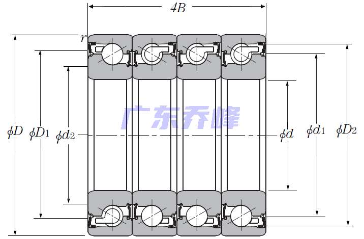 滾珠絲杠用四列角接觸推力球軸承 - DBTT配對,雙面密封,三排承受軸向載荷 - 尺寸