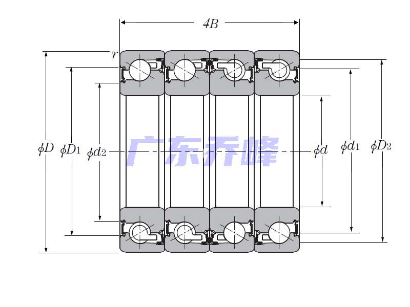 滾珠絲杠用四列角接觸推力球軸承 - 開式,兩排承受軸向載荷 - 尺寸