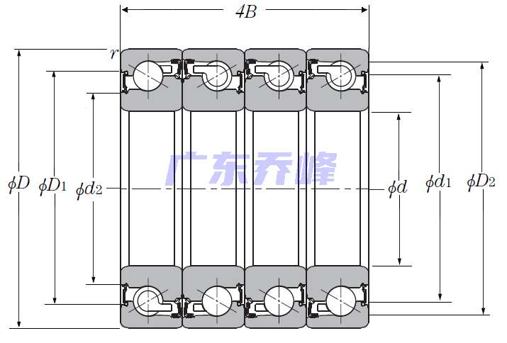 滾珠絲杠用四列角接觸推力球軸承 - DFTT配對,雙面密封,三排承受軸向載荷 - 尺寸