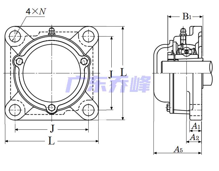 軸承型號:CM-UKF322D1(配合軸承:H2322X),四螺栓方形法蘭式軸承座,鑄造外殼,帶緊定襯套,鑄造防塵蓋,封閉端蓋,UKF型