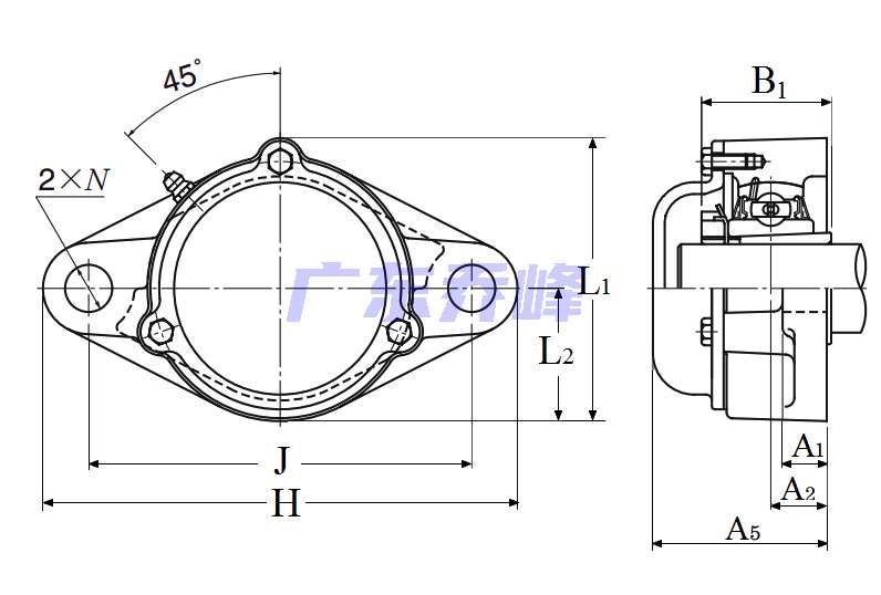 軸承型號:CM-UKFLX09D1(配合軸承:HA2309),雙螺栓菱形法蘭式軸承座單元,鑄造外殼,帶緊定襯套,鑄造防塵蓋,封閉端蓋,UKFL型