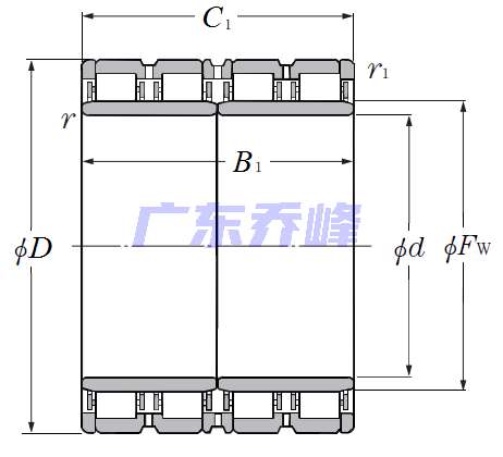 軸承型號:E-4R11001,四列圓柱滾子軸承帶空心滾柱&銷式保持架,其基礎型號為11001,前綴列表:【E-:表面滲碳鋼】【4R:四列】