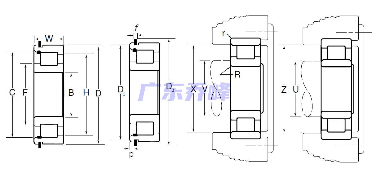 | 不可分離型型 Bearing -內圈帶兩個加強筋,外圈帶一個加強筋,帶擋圈,帶止動環 - 尺寸 | |
