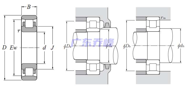 | 圓柱滾子軸承 -內圈帶兩個加強筋,可分離型,普通外圈 - 尺寸 | |