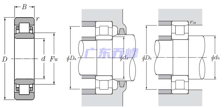 | 圓柱滾子軸承 -可分離型,普通內圈,外圈帶兩個加強筋 - NU型 - 尺寸 | |