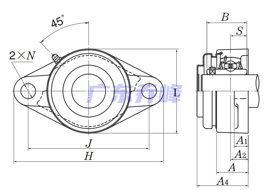 軸承型號:SM-UCFL209D1,雙螺栓菱形法蘭式軸承座單元,鑄造外殼,帶緊定螺釘,壓制鋼防塵蓋,封閉端蓋,UCFL型