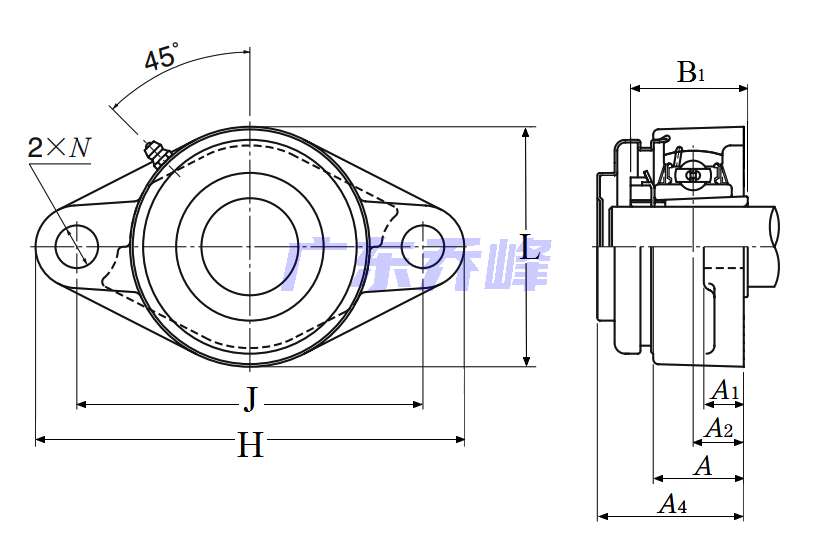 軸承型號:SM-UKFL211D1(配合軸承:HS2311XY),雙螺栓菱形法蘭式軸承座單元,鑄造外殼,帶緊定襯套,壓制鋼防塵蓋,封閉端蓋,UKFL型