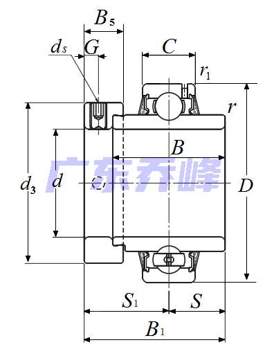 軸承型號:UELS306D1,帶偏心鎖緊套的外球面軸承,寬外圈 - 圓柱內徑,其基礎型號為306,前綴列表:【UEL:寬內圈,鎖圈帶拋油環】【S:圓柱外圈】,后綴列表:【D1:帶油槽油孔,可再潤滑】