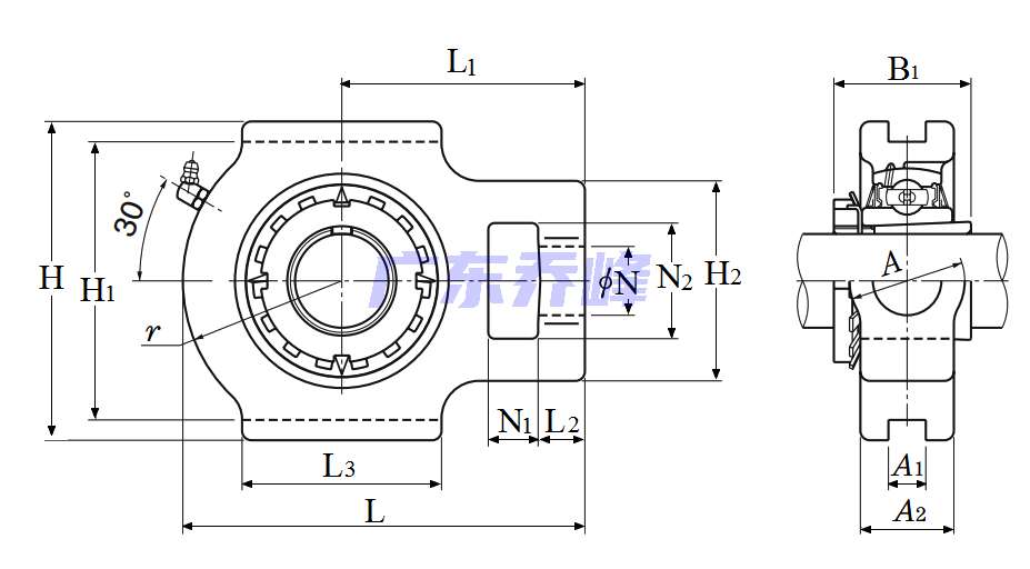 軸承型號:UKTX09D1(配合軸承:HE2309X),滑塊式軸承座,鑄造外殼,帶緊定襯套,UKT型